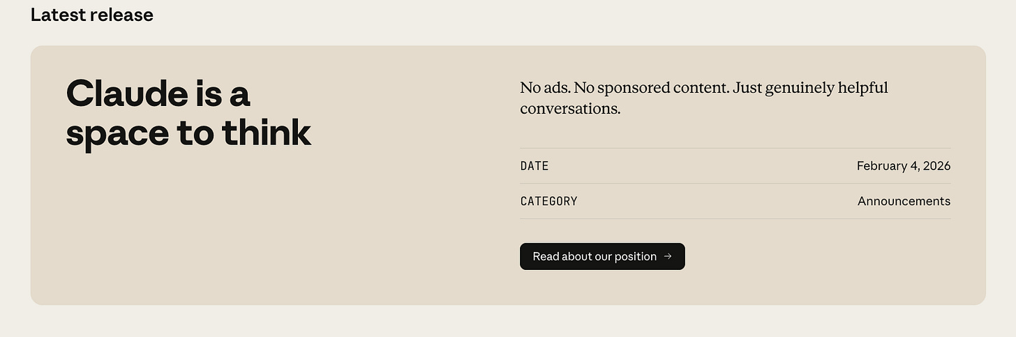 Everyone’s waiting for the next model drop. Refreshing the page, watching X, checking Discord. Anthropic knows this. They know exactly where our eyes are pointed. And instead of giving us what we expected, they used that moment - that window of maximum attention - to deliver something else entirely. A manifesto. A line in the sand. A declaration that Claude will remain ad-free, full stop.